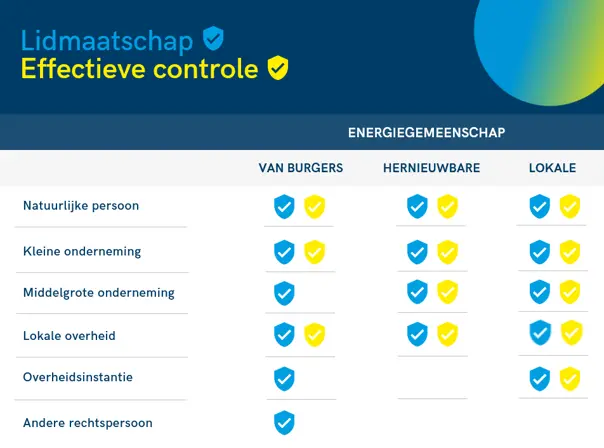 L’ordonnance électricité définit, par type de communauté, la qualité des membres pouvant y participer et identifie les membres pouvant exercer un contrôle effectif (contrôle au sens de l’article 1:14 du Code des sociétés et des associations).