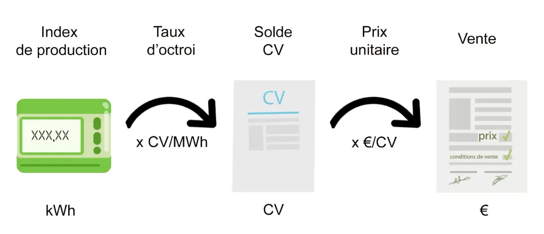 Si une installation PV de 6 kWc est mise en service, elle aura droit à 1,953 CV par MWh produit.