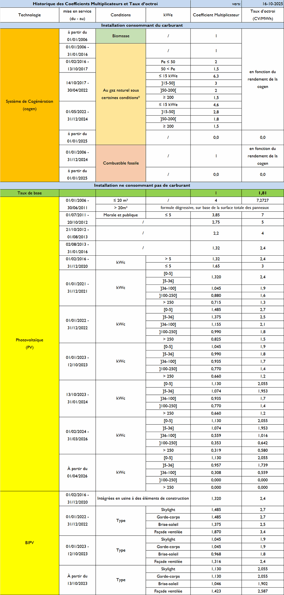 Le tableau ci-dessous récapitule les coefficients multiplicateurs en vigueur jusqu’au 31/03/2026 et le taux d’octroi pour l’ensemble des technologies.
