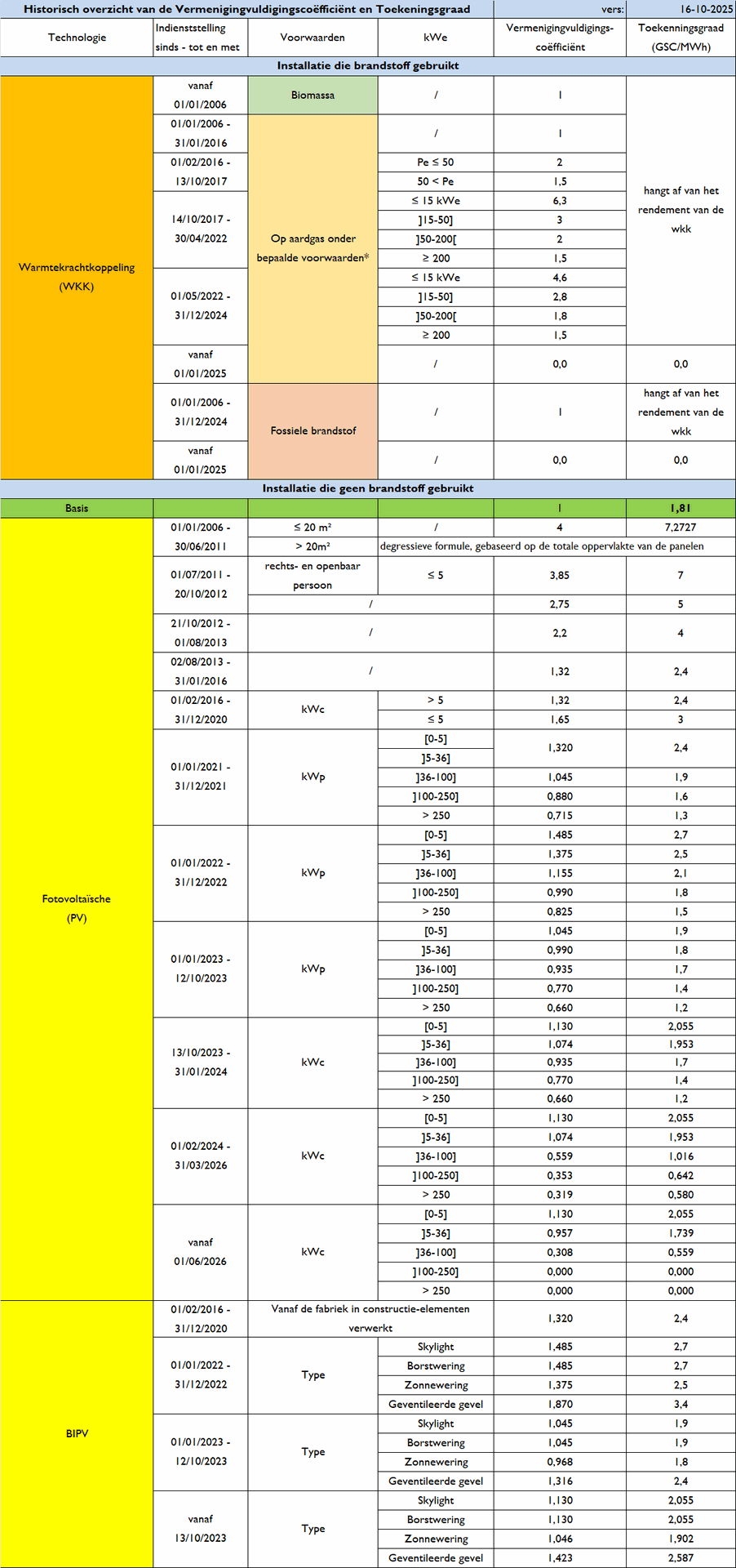 Pour les cogénérations : Suite à une décision du Gouvernement prise en juin 2023, les cogénérations consommant du combustible fossile et mises en service à partir du 01 janvier 2025 ne seront plus soutenues. (Arrêté Besluit 08/06/2023)