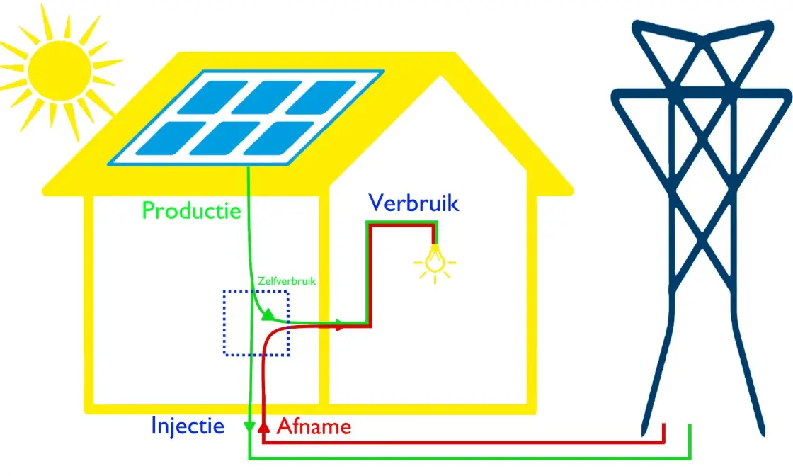 De elektriciteit die niet onmiddellijk zelf wordt verbruikt, wordt op het netwerk geïnjecteerd.